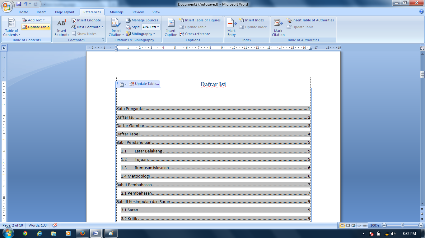 Jika mengubah Daftar isi karena sudah mengubah format number halaman makalah, tinggal klik References terus Update Table dan pilih Update Entire Table, klik OK